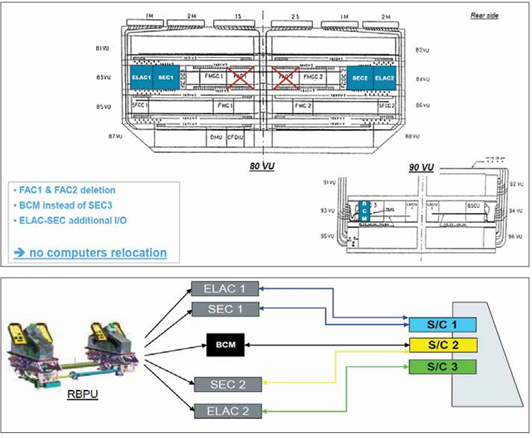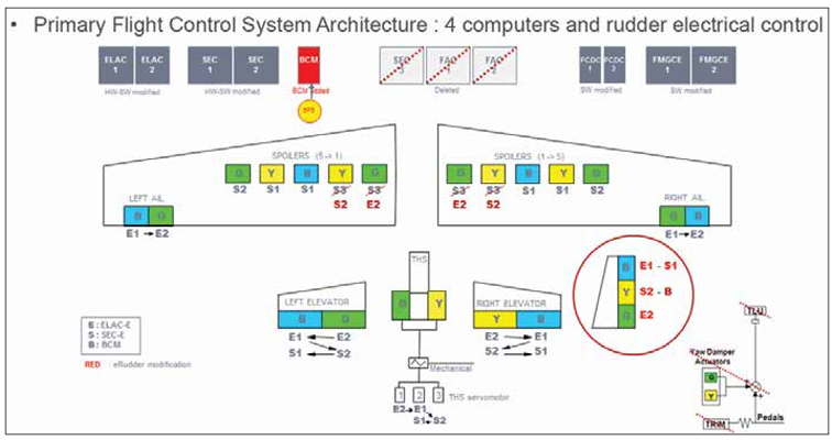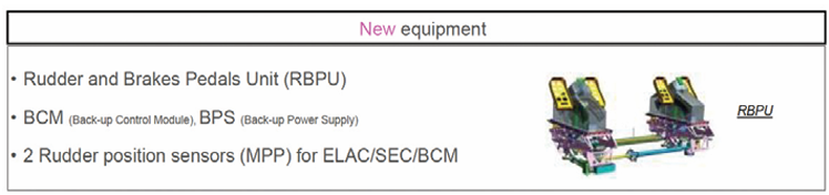 Yeni eklenen ekipmanlar; Rudder and Brakes Pedal Unit (RBPU), BCM (Back-up Control Module), BPS (Back-up Power Supply), 2 Rudder position sensors (MPP) (ELAC, SEC ve BCM için).