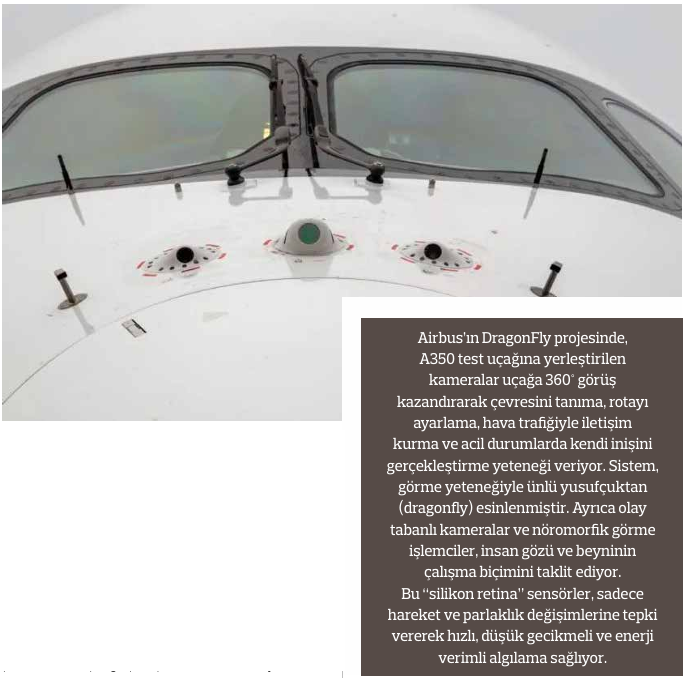 Airbus’ın DragonFly demonstrasyon projesinde, bir A350 test uçağının burnuna monte edilen üç kamera, uçağa adeta “360 derece görüş” kazandırarak çevresini tanımasını sağlıyor. Bu sistem, manzaradaki sabit özellikleri (örneğin arazi şekilleri veya yapıları) tanıyıp referans alarak uçağın rota ve yaklaşma konusunda kendi kendini yönlendirmesine olanak tanıyor. DragonFly sistemi, etrafındaki hava sahası, arazi ve hava durumu koşullarını sürekli tarayarak rotayı dinamik şekilde güncelleyebiliyor; aynı zamanda otomatik olarak hava trafik kontrolü ve operasyon merkezine bilgi gönderebiliyor. Bu sayede pilotların iş yükünü azaltmayı ve acil durumda (örneğin bir pilot bayılırsa) uçağın güvenli bir şekilde kendi inişini gerçekleştirebilmesini hedefliyor.