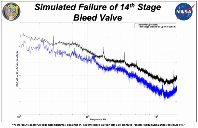 Örneğin NASA’nın VIPR programı kapsamında gerçekleştirilen deneylerde, 14. kademe bleed valfinin tam açık (failsafe) konumunda takılı kaldığı bir arıza senaryosu oluşturuldu. Bu senaryoda mikrofon A4, motorun hızlanması sırasında arızanın yol açtığı anormal ses desenini net biçimde yakaladı; üstelik bu anormal imza hem kademeli hem de ani hızlanma durumlarında tespit edilebildi.