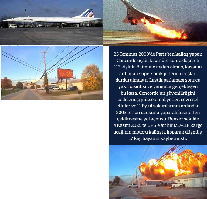 25 Temmuz 2000’de Concorde, pistteki metal parça nedeniyle lastiği patlayıp yakıt sızıntısı ve yangına yol açarak düştü; 113 kişi hayatını kaybetti. Kazadan sonra uçuşlar durduruldu, 2001’de teknik modifikasyonlarla yeniden başladı ancak yüksek maliyet ve güven kaybı nedeniyle 2003’te emekliye ayrıldı. 4 Kasım 2025’te ABD’de MD-11F kargo uçağının sol motoru koparak 17 kişinin ölümüne yol açtı; FAA uçuşları yasakladı. MD-11, DC-10’un modernize edilmiş versiyonu olup kargo operasyonlarında kullanılıyordu.