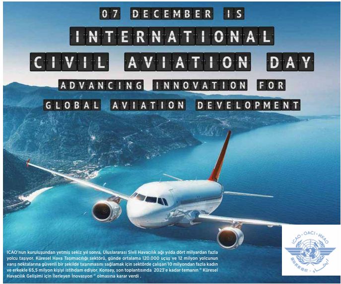 7 Aralık 1944 yılında Chicago anlaşması ile kurulan ve Türkiye’nin de kurucu üyesi olduğu uluslararası sivil havacılık örgütü, kuruluşunun 50. yılı olan 1994 yılında aldığı genel kurul kararıyla 7 Aralık’ı dünya sivil havacılık günü olarak ilan etmiştir. Uluslararası Sivil Havacılık Gününün amacı: Sivil havacılığın devletlerin sosyal ve ekonomik kalkınması için önemi konusunda dünya çapında farkındalık oluşturmayı amaçlamak ve güçlendirmeye yardımcı olmak ayrıca ICAO’nun devletlerin işbirliği yapmasına ve tüm insanlığın küresel, hızlı bir taşıma ağı gerçekleştirmesinde yardımcı olarak bu ağı tüm insanlığın hizmetine sunmak.
