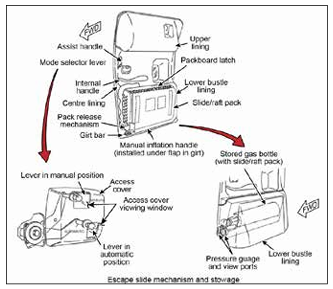 Sürgünün doğru şekilde açılabilmesi için, aspiratörler dış kapağın hemen altına gelecek şekilde paketlenmiştir. Tamamen bağımsız olan sürgü paketi, uçak tipine bağlı olarak yaklaşık 3 ft genişliğinde, 2,5 ft uzunluğunda ve yaklaşık 1 ft yüksekliğindedir. Paketin ortasında, ön kısmında, “girt” adı verilen çok katmanlı ağır üretan veya neopren/naylon kumaştan yapılmış bir parça, yaklaşık 0,61 m (2 ft) uzunluğunda sarkık olarak bırakılmıştır. Uçağa takıldığında, bir “girt çubuğu” girtin ortasından, dış ucundan geçirilir ve çıkış kapısının hemen içinde ve önünde, iç zemine tutturulur. Bu girtin ön yüzünde büyük kırmızı harflerle talimatlar ve üzerinde “PULL” (ÇEK) yazan bir tutamak bulunur.